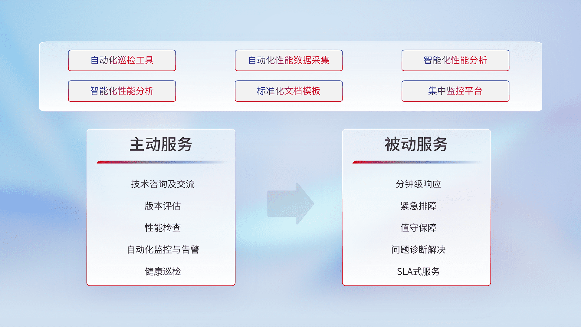 智能化工具和标准化文档,,,,保障服务质量,,提供主动服务(包含技术咨询、、版本评估、、、、性能检查、、、自动化监控与告警、、、、健康巡检)和被动服务包含(分钟级响应、、、、紧急排障、、值守保障、、、、问题诊断解决、、、、SLA服务)。。。
